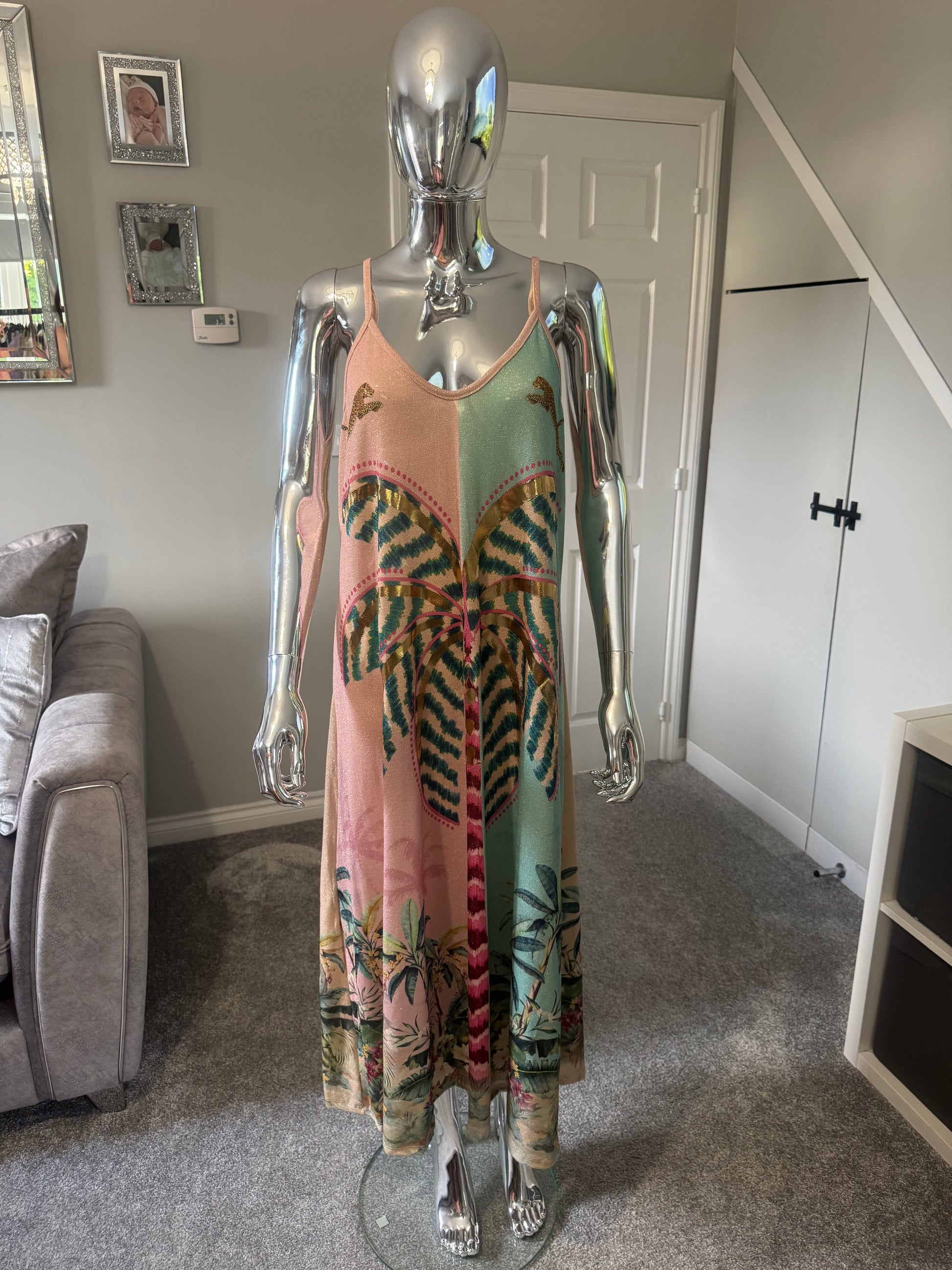 Welcoming our stunning blue and pink strap palm tree maxi dress perfect for all occasions. This is one size from an 8-18.