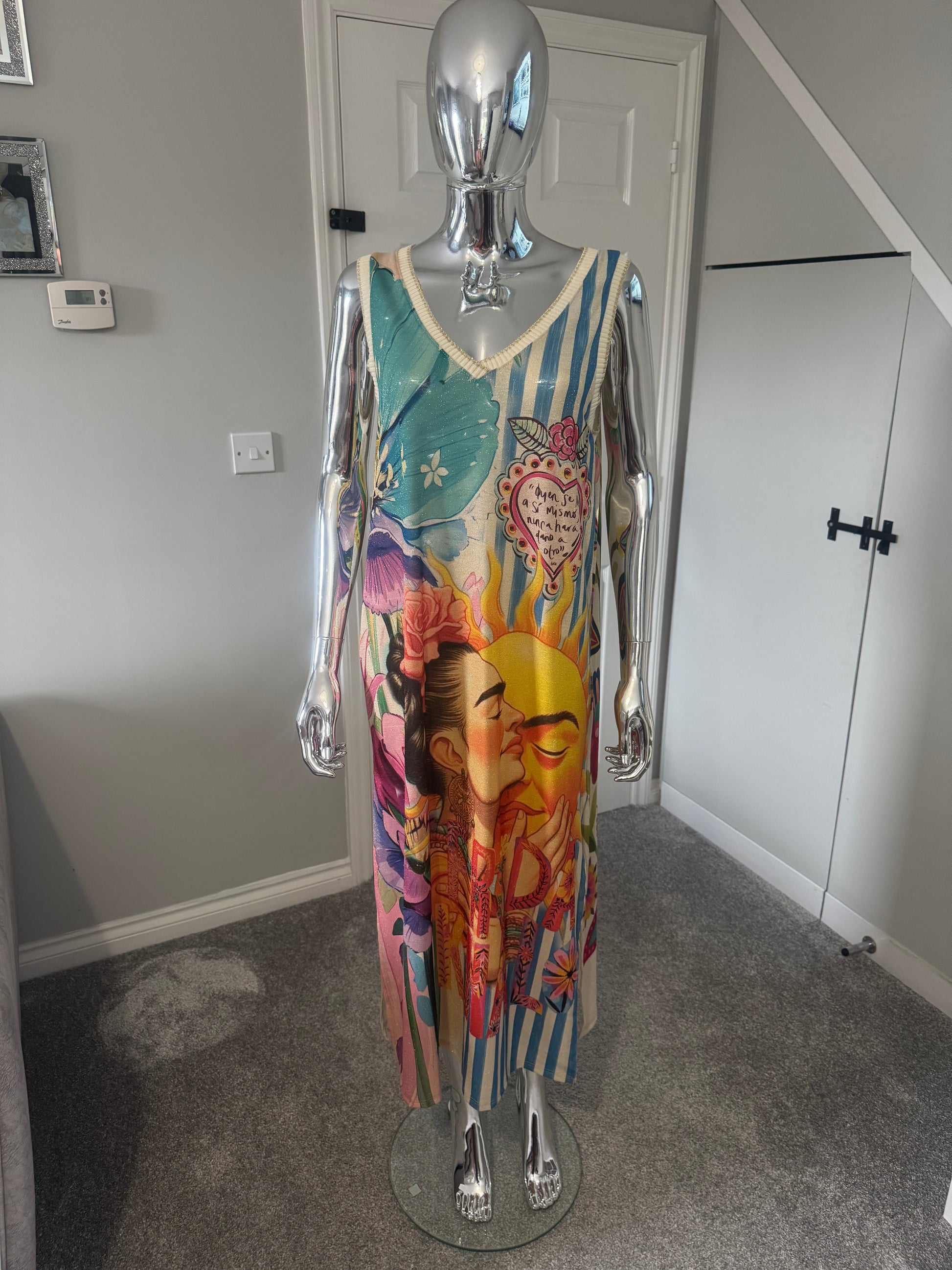 Introducing our Frieda sun dress, this is lurex material. Perfect for the summer. This is one size from an 8-14.