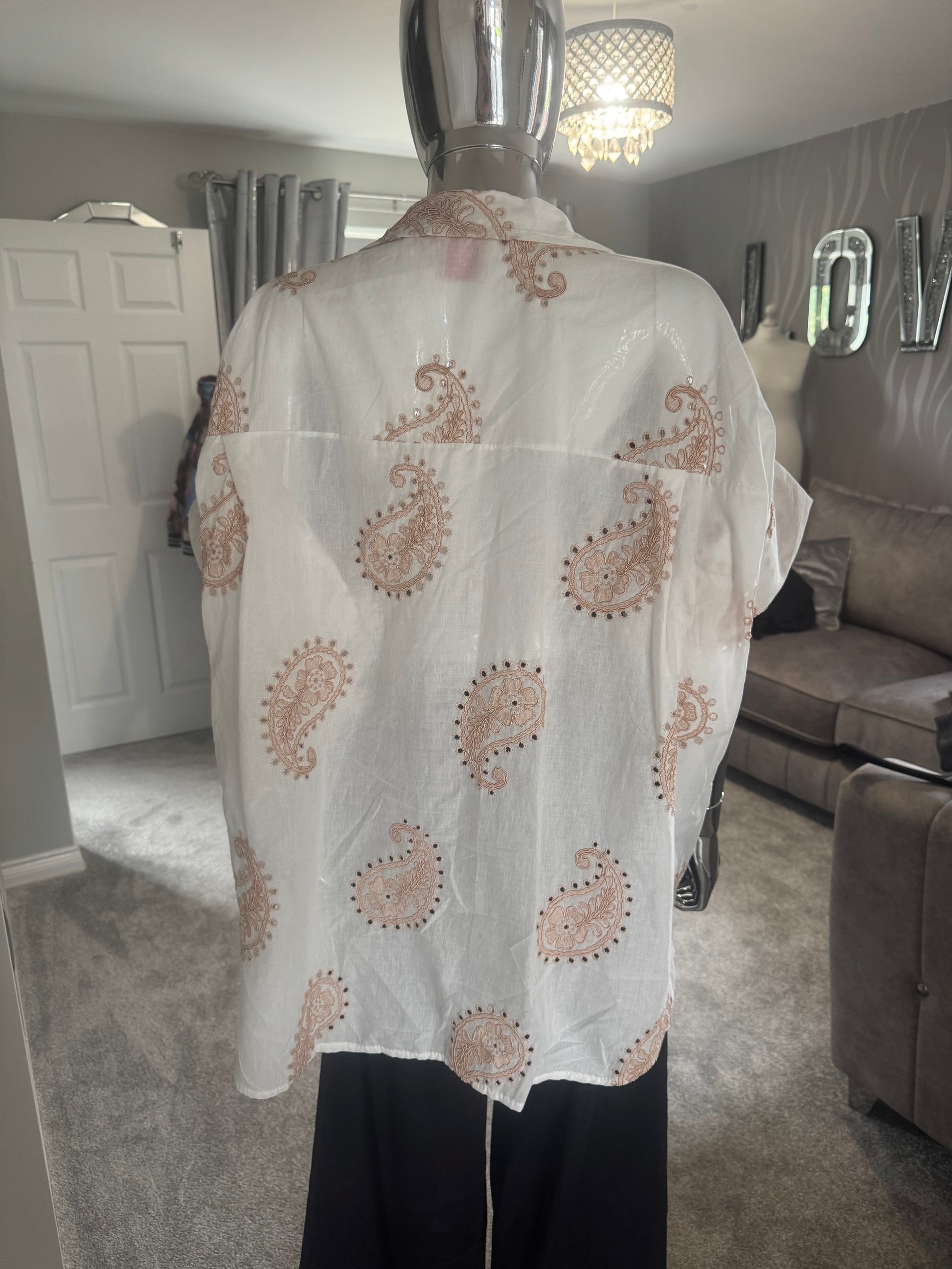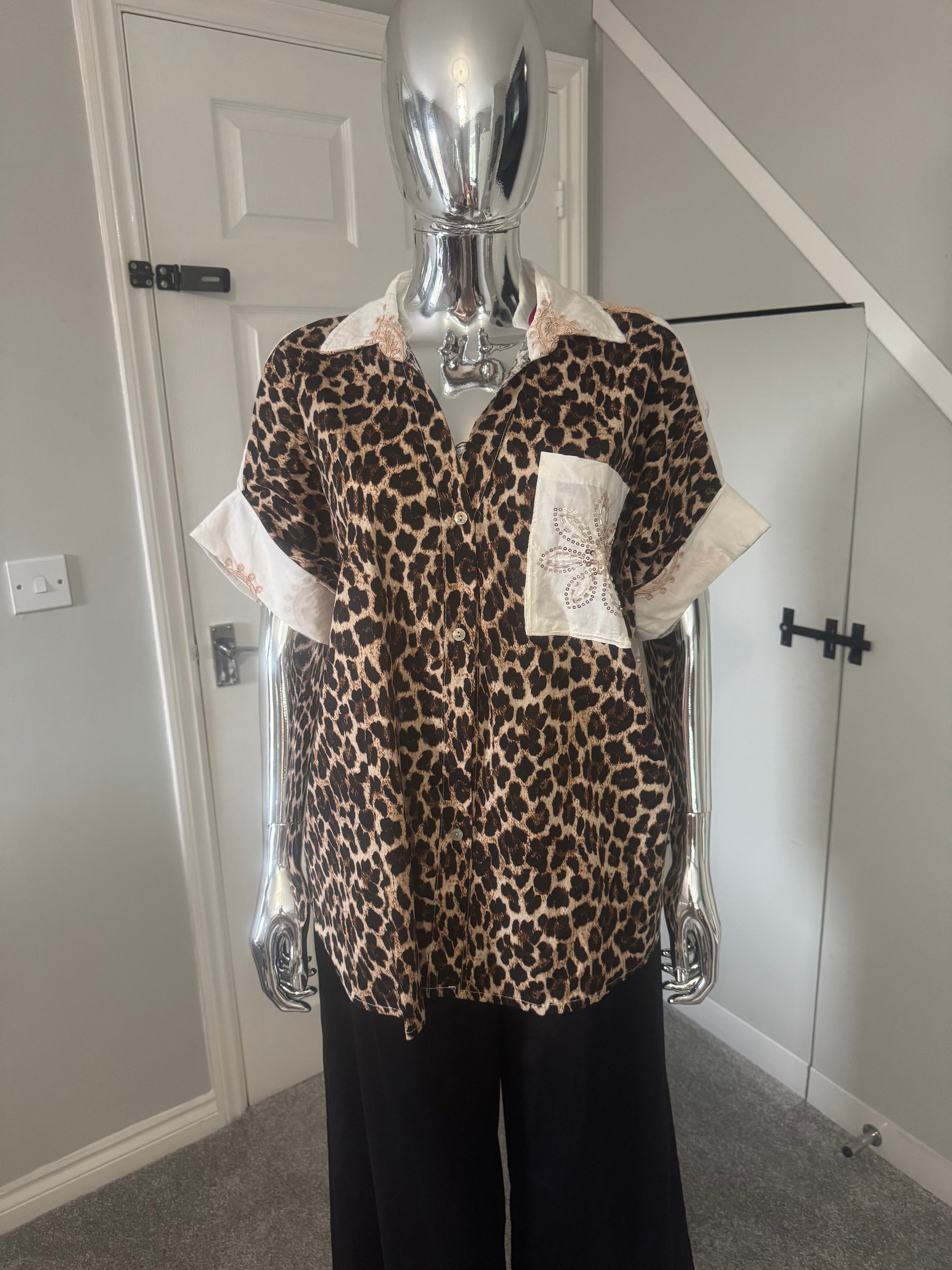 Introducing this stunning leopard print shirt, this has a seashell style at the back with a sequin flower on the pocket. This is also lightweight and flowy. One size from an 8-16.