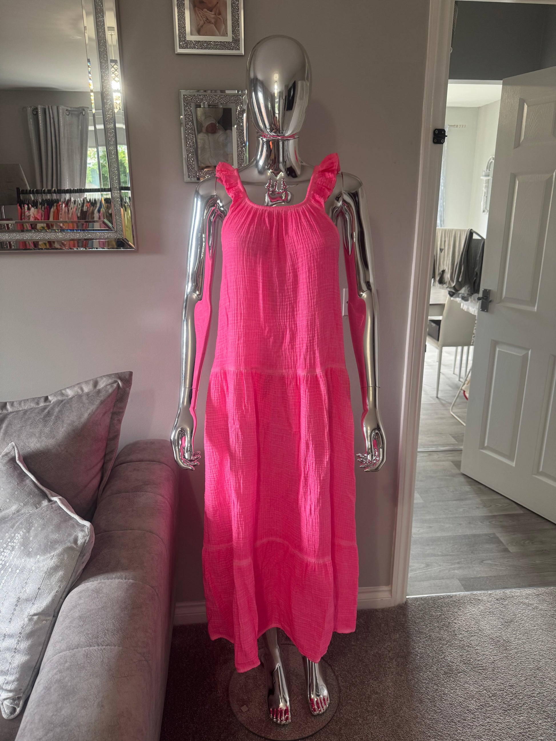 Introducing our neon pink cheesecloth dress this is lightweight so perfect for the summer. This is one size from an 8-14.