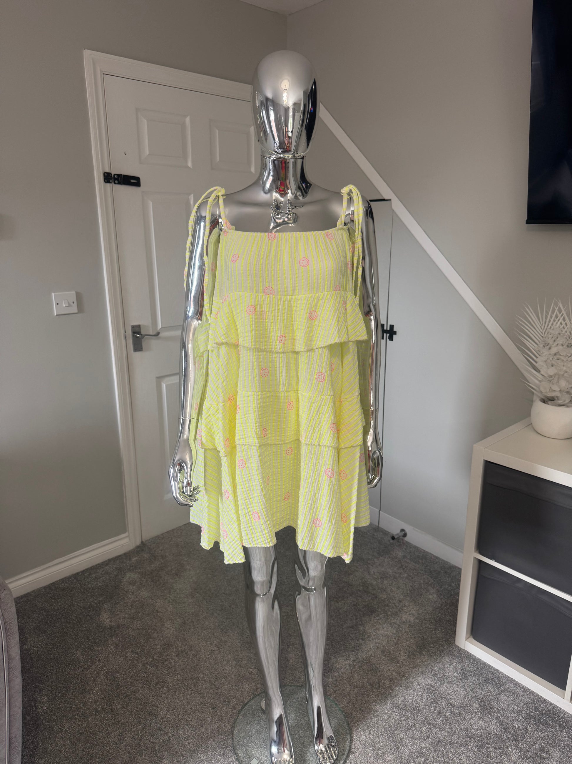 Neon yellow smiley face cheesecloth ruffle dress