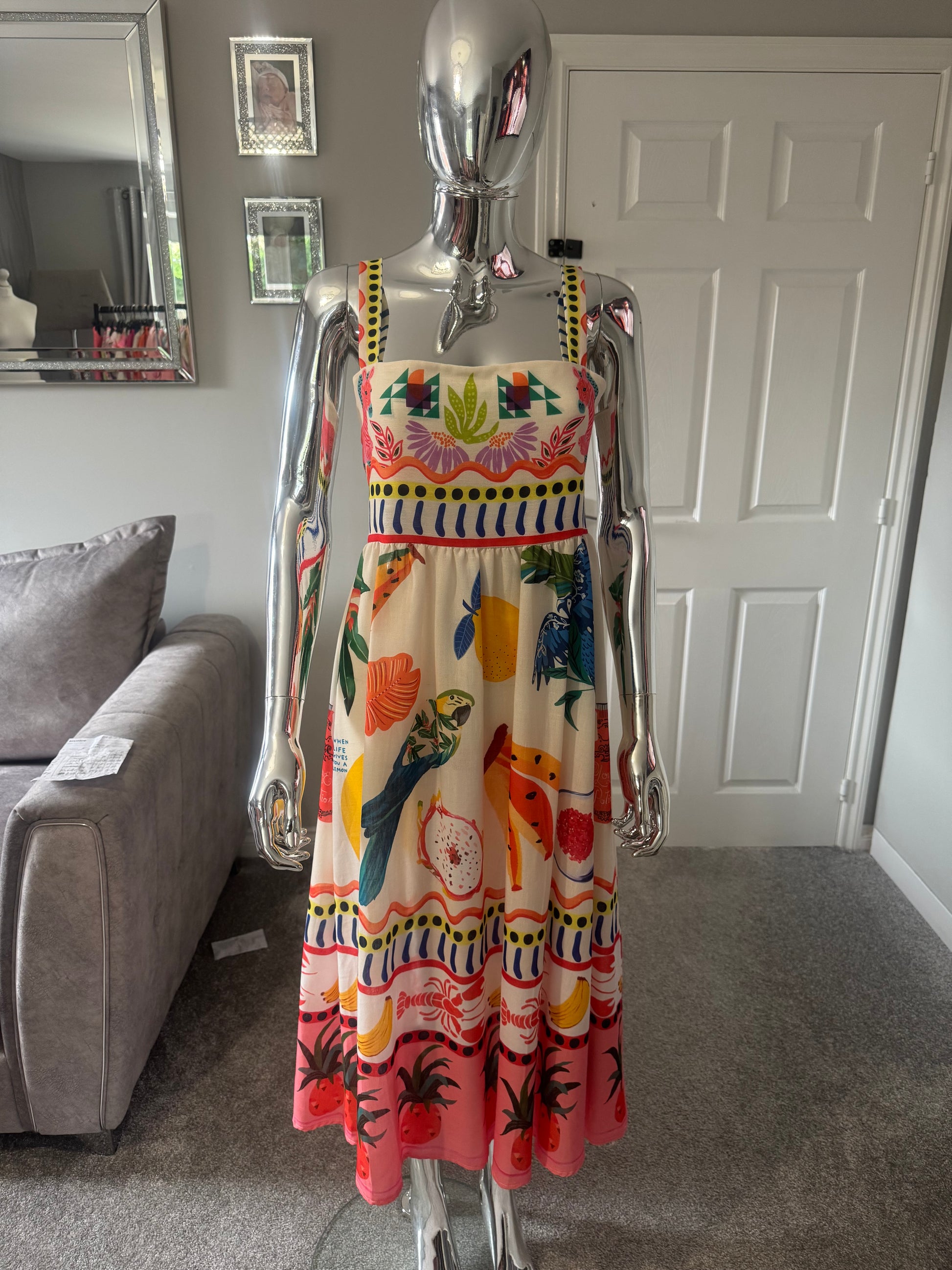 Introducing our parrot print midi length dress perfect for all occasions this is one size from an 8-14.